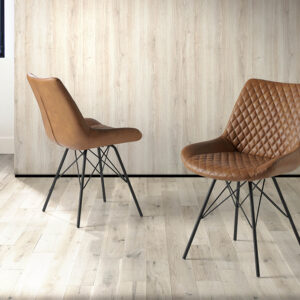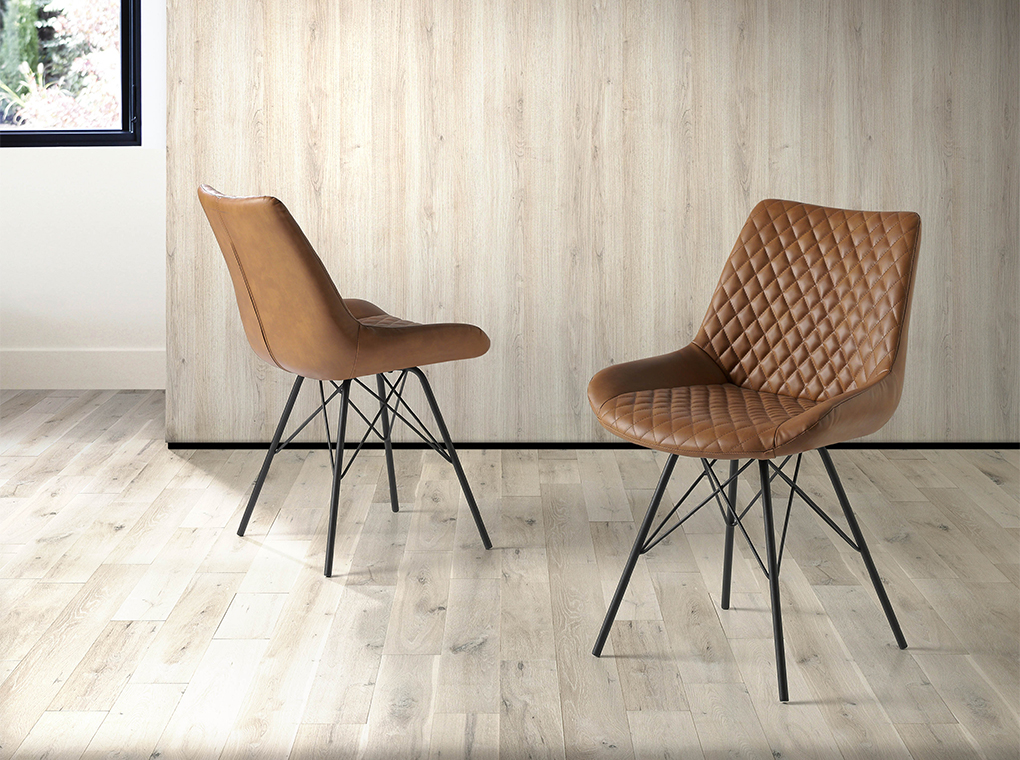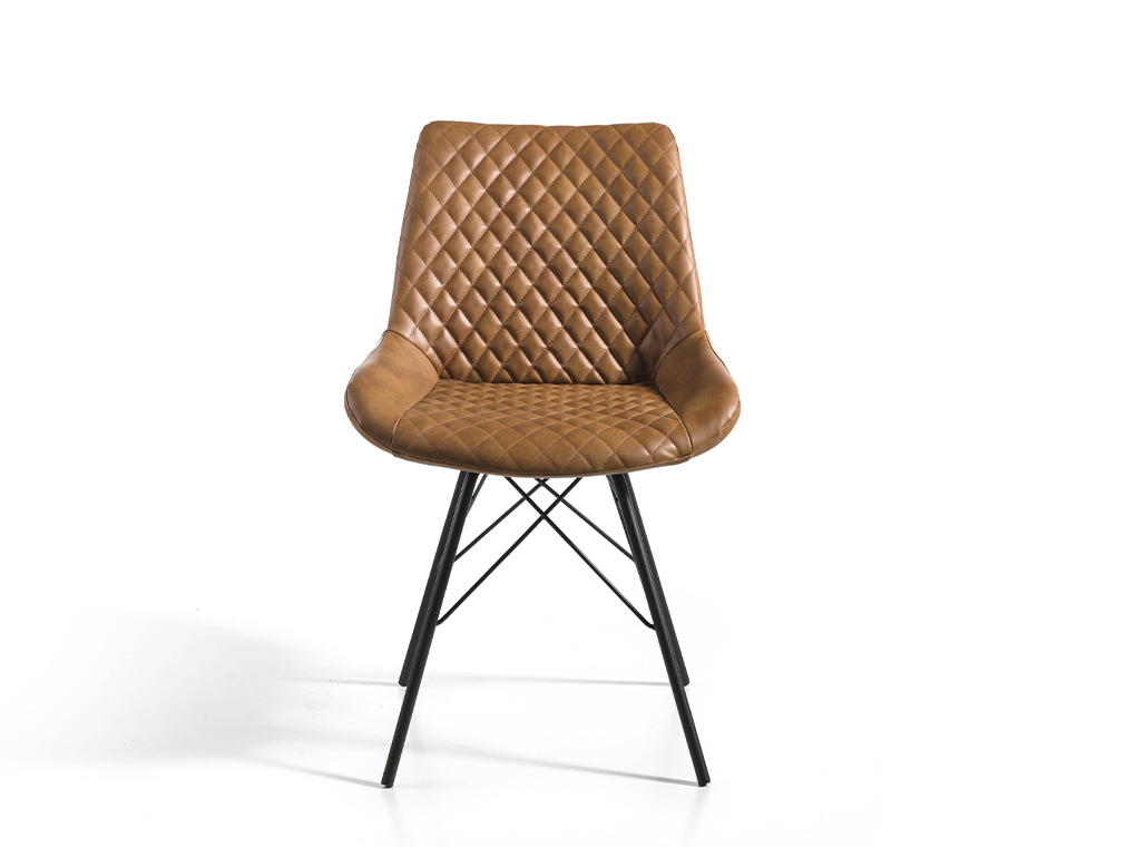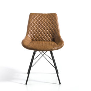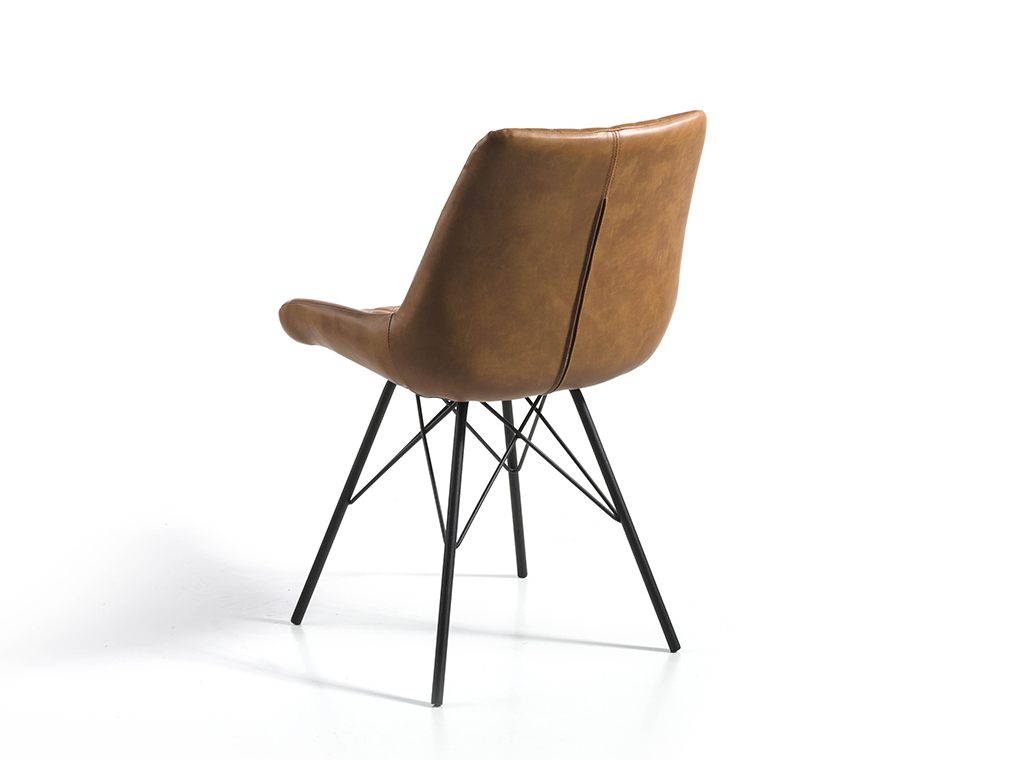 Silla de comedor con patas negro mate, asiento y respaldo tapizados en polipiel marrón claro.