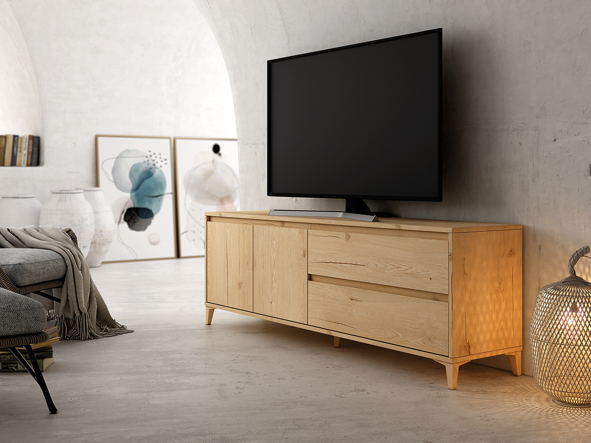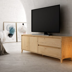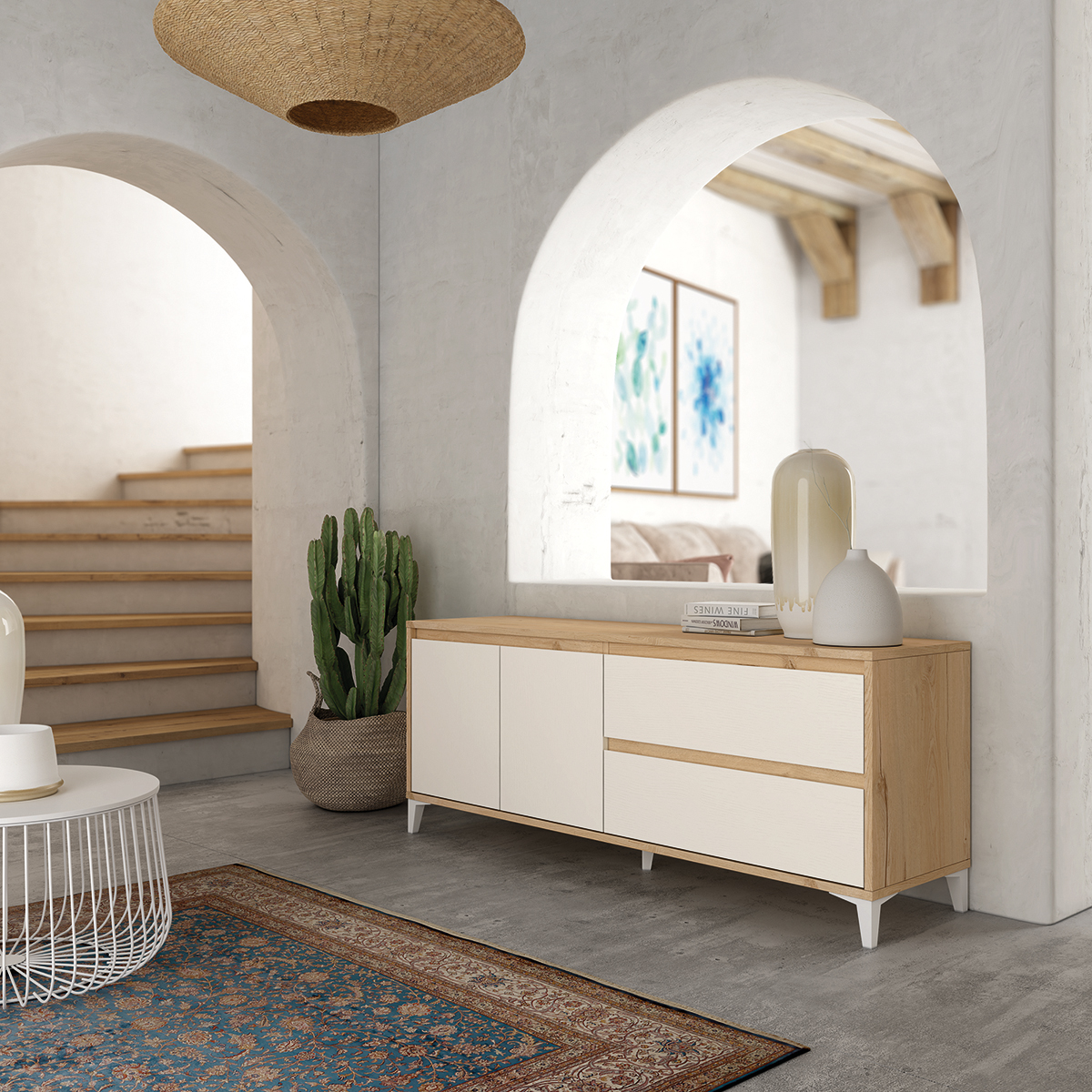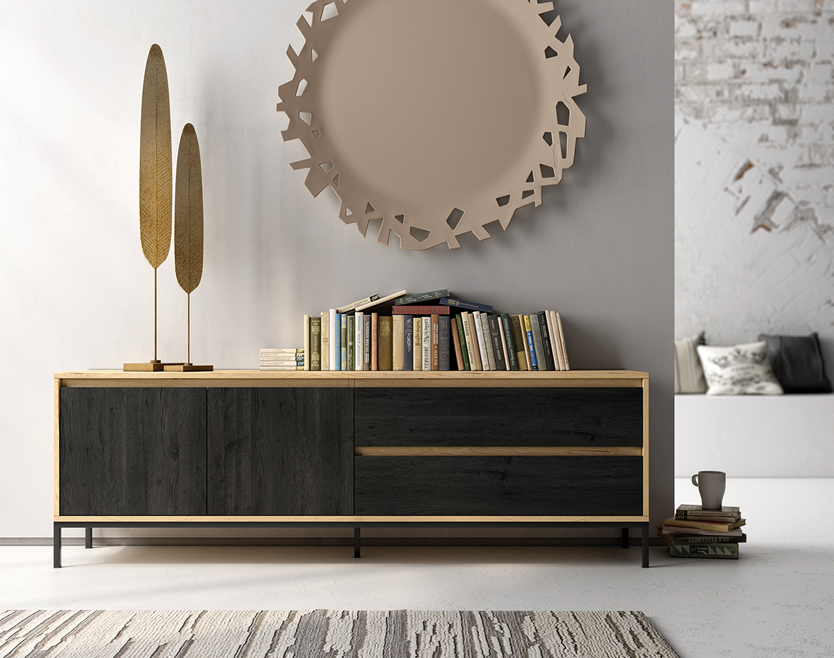 Tablero de madera reciclada recubierto de chapa sintética a poro abierto y herrajes metálicos de primera calidad.