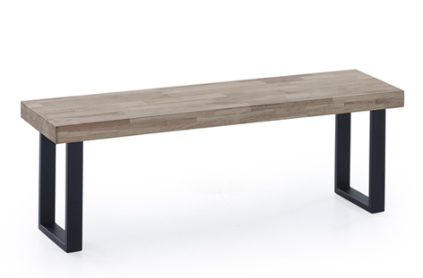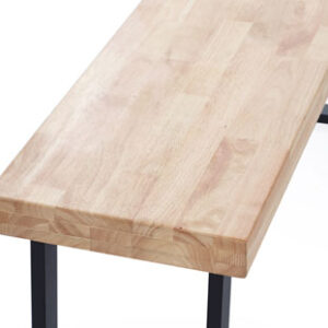 Banco con asiento en madera de roble y patas metálicas negras.
