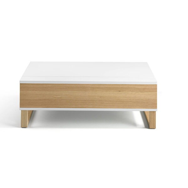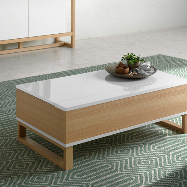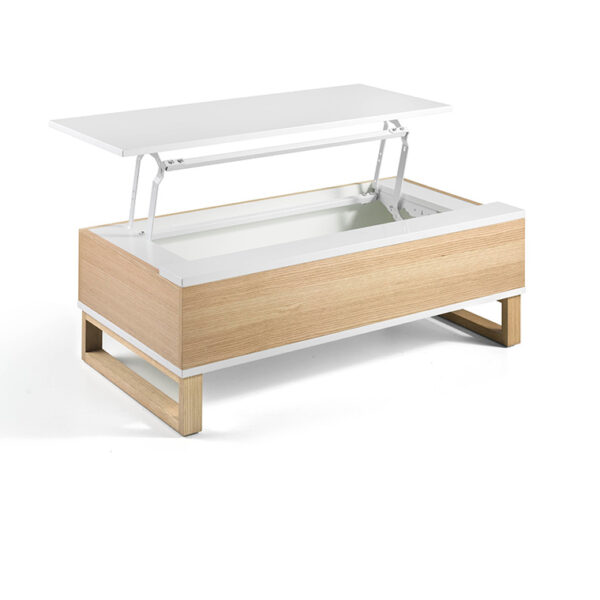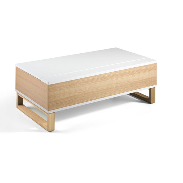 Mesa de centro rectangular con sobre elevable de MDF lacado blanco brillo, cuerpo y patas con acabado en madera de roble .